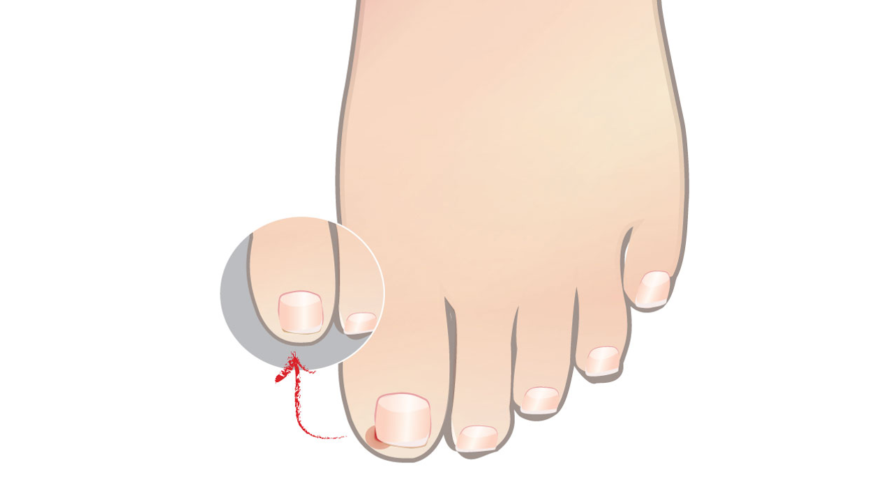 An ingrown toenail is a common problem where the nail grows into the toe. Tight-fitting shoes and socks that squeeze and pinch the toes and feet can also cause ingrown toenails. Then using a cotton wool bud push the skin fold over the ingrown nail down and away from the nail.